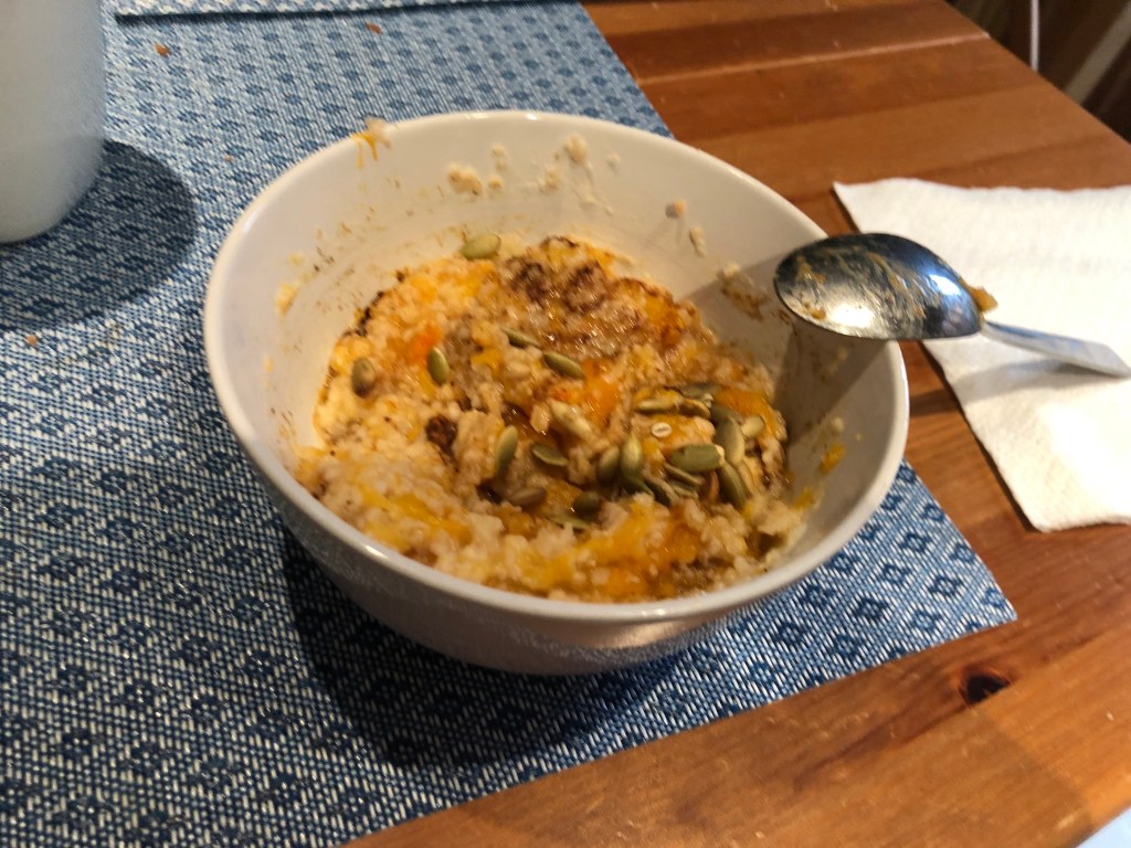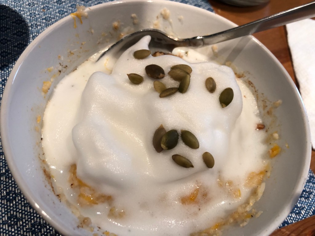 The next morning breakfast: oatmeal with flaxseed, mixed with pumpkin puree, ginger, and cinnamon. Cold frothed milk and pumpkin seeds on top.