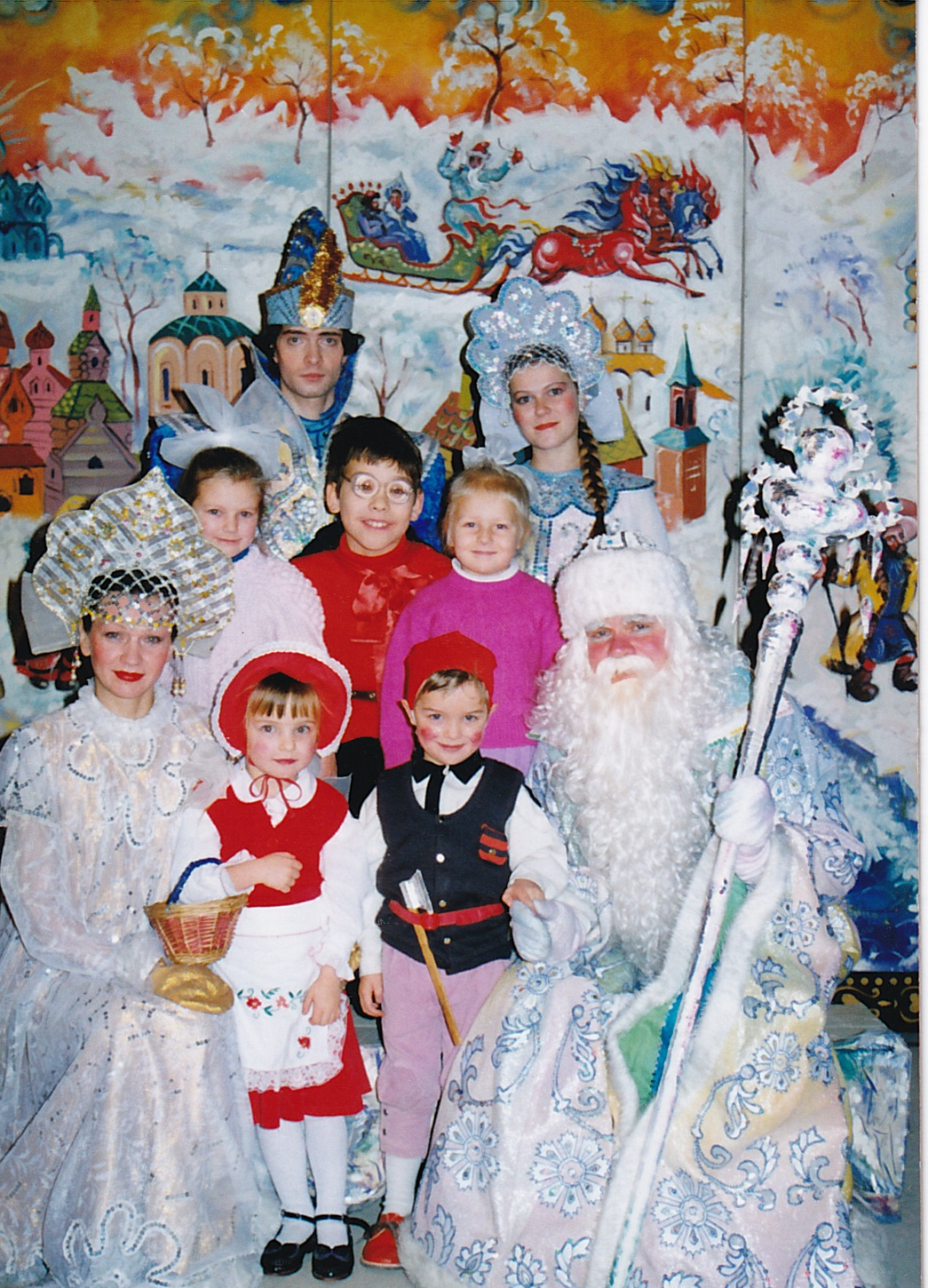 There is a Prince (Tsarevich) and a Princess (Tsarevna) on the back. Next row: a girl who’s name I can’t remember, to my shame, then Igor dressed as a Vampire, and then our friend Ania, who participated in so many activities with us. Finally in the first row: Snow girl (Snegurochka), a granddaughter of Grandfather Frost, Anna dressed as a Little Red Riding Hood, Vlad dressed as a Dwarf and Grandfather Frost himself, is his blue and white coat.