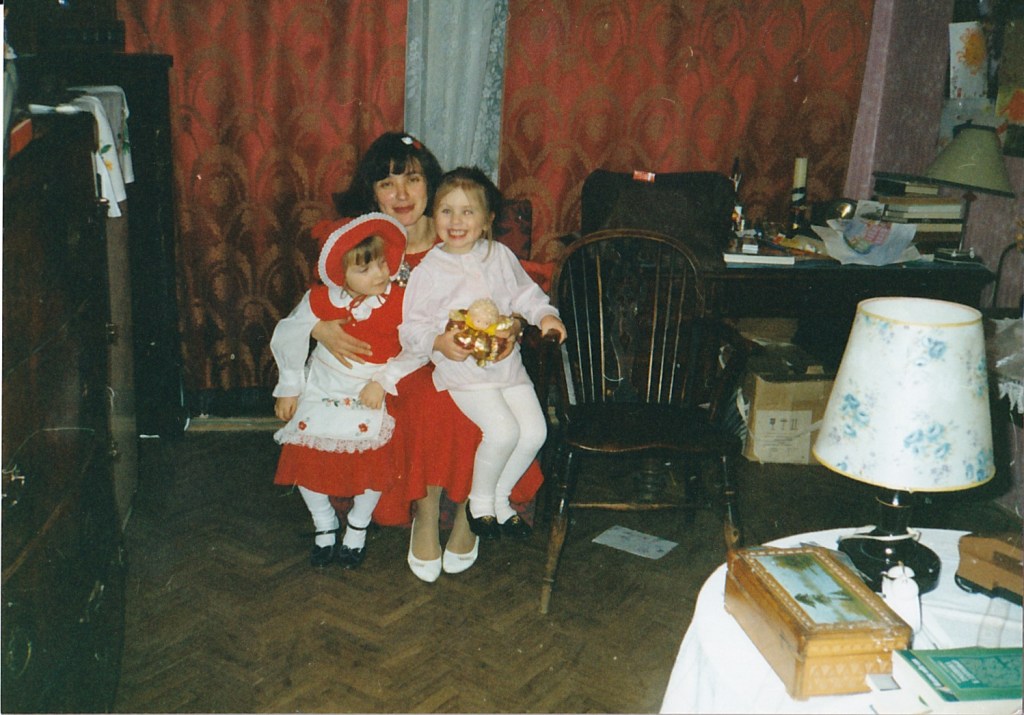 They are dressed in the same costumes as on the photo with a children’s musical cast. Igor is a Vampire, Vlad is a Dwarf, and Anna is a Little Red Riding Hood. I am recycling my High School Graduation dress with all accessories.