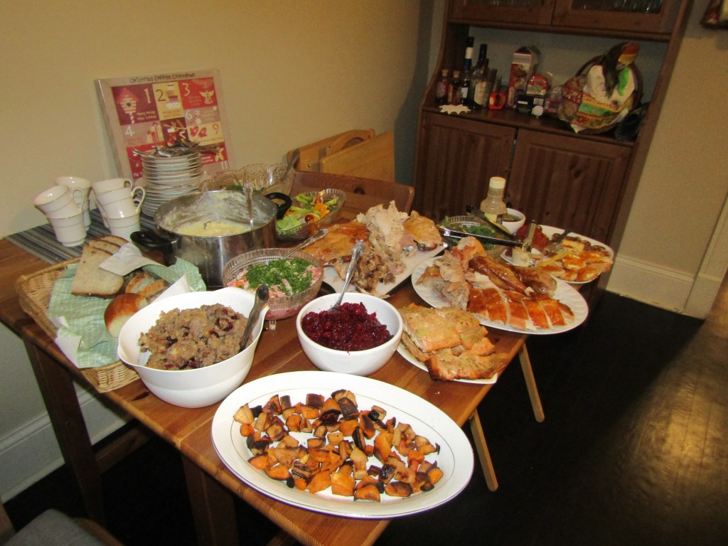 Boris could not make it this year because several work things piled up, and Vlad almost never can make it. We ended up having a family zoom, but a big part of the family was at one place, unlike last year. It was also an opportunity to test the setup with my large movable screen – we moved it to the dining room for “giving thanks.”