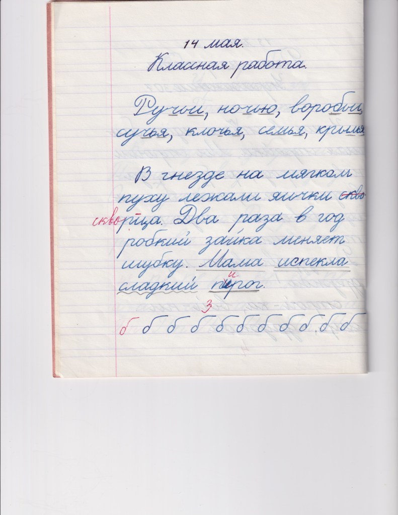 The classwork for May14. I gir a “three” for it, somewhat between C and D – th lowest “satisfactory” grade. The work is marked down for two mistakes: 1) I broke one word in the wrongз place when going to the next line, and 2) I corrected a misspelled word