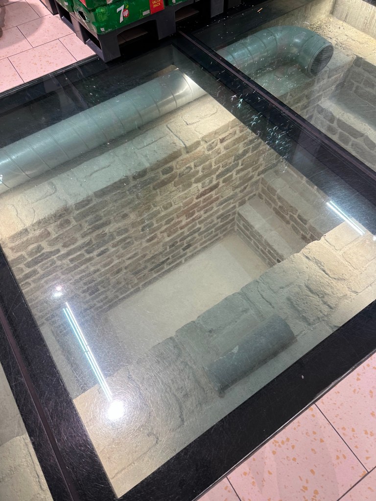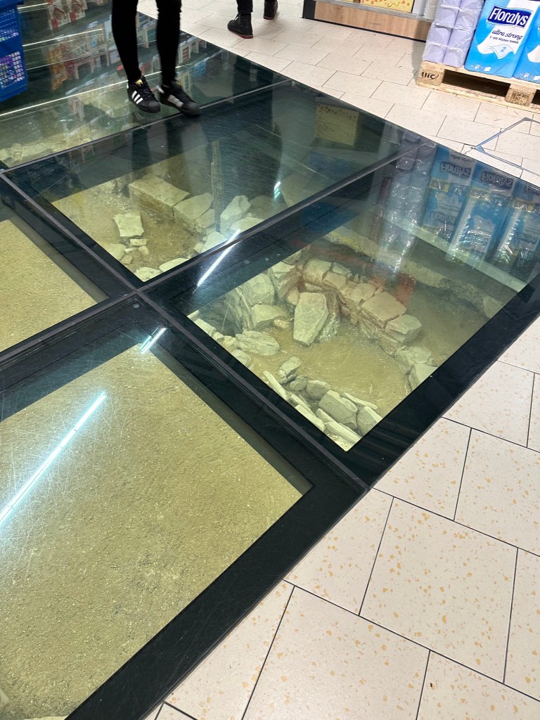 Walking through the city after the parade. These windows to the underground structures are made inside a busy supermarket.