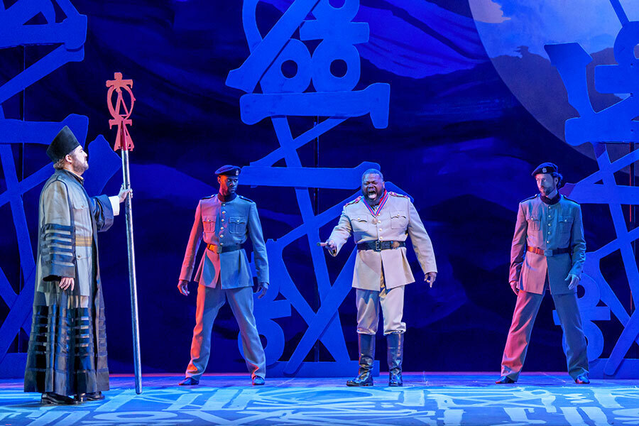 I copied several images from the Lyric website to illustrate. I do not understand why they had to invent their own hieroglyphs instead of Egyptian, and why they had to cover the whole stage set with these images. I do not understand why they had to dress the male cast in these turn-of-the-previous-century uniforms.