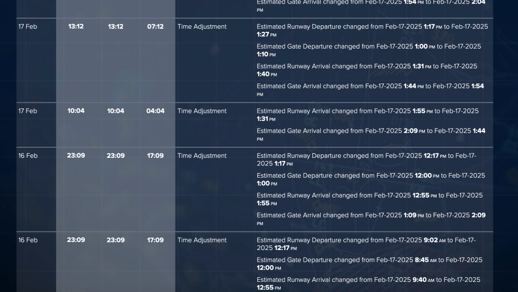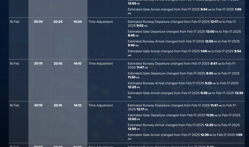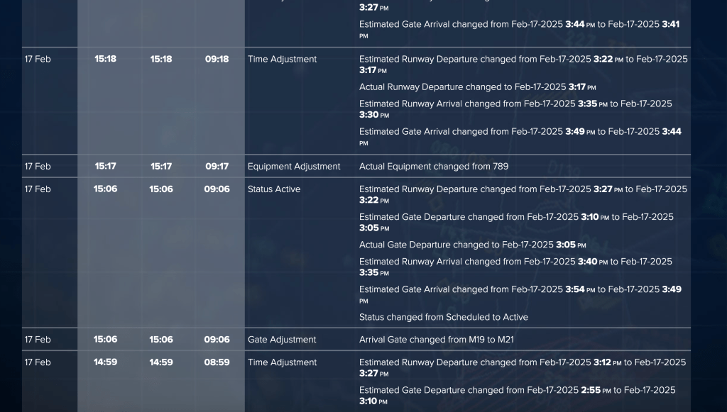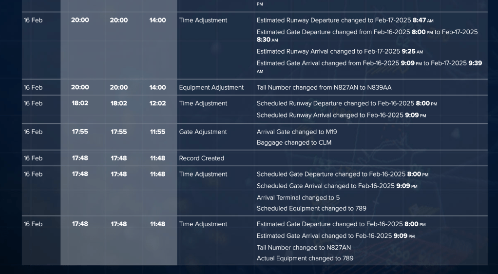 Fortunately, I found a website that showed all the “flight notes,” so I knew about all the expected delays and new estimated times. After the aircraft finally landed in ORD, I tried to take several screenshots to capture all the changes.