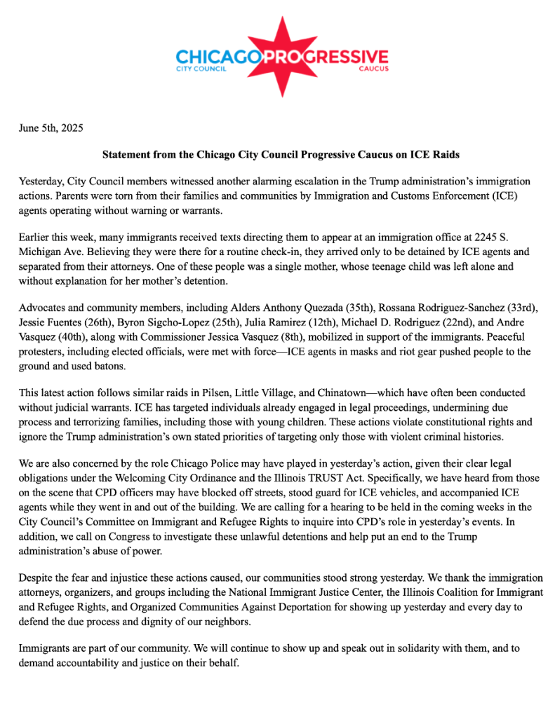“It’s a war on our culture. It’s a war on our democracy. It’s a war on our humanity. I am counting on all of Chicago to resist in this moment because, whatever particular vulnerable group is being targeted today, another group will be next. … None of us are immune from this disease.”